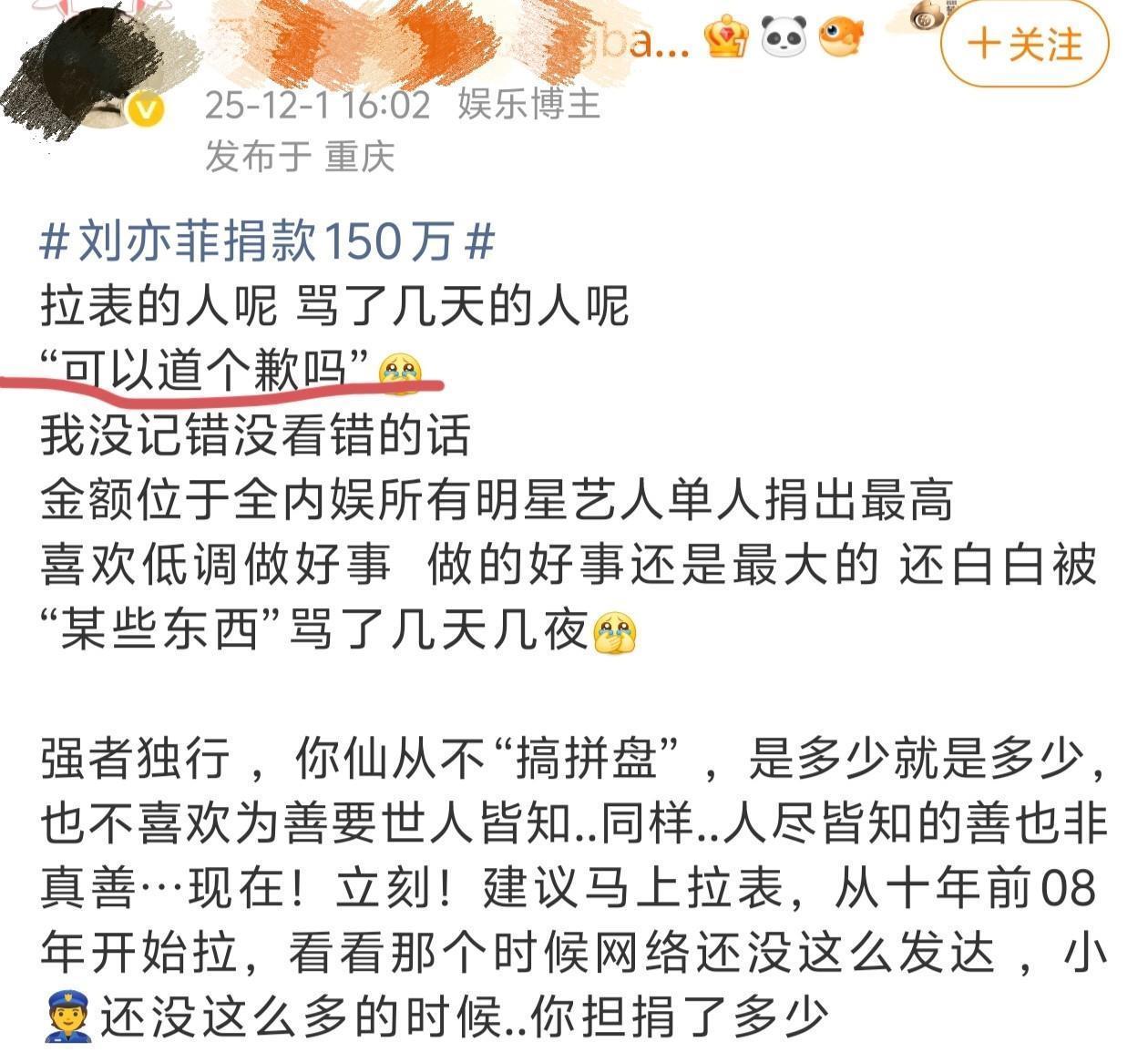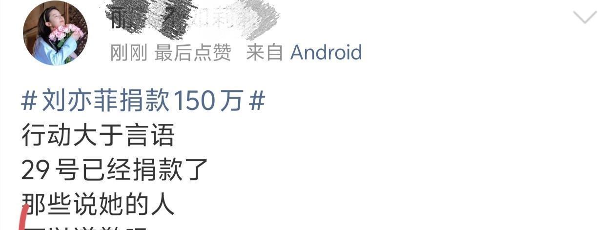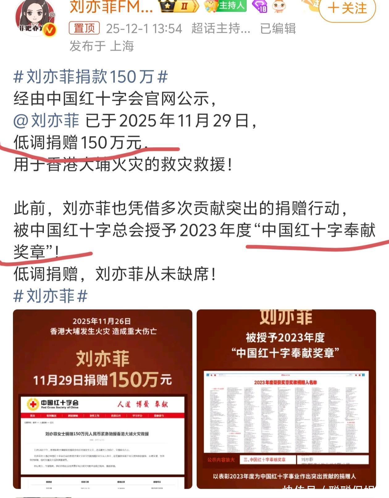 这不,对于一向处于舆论风口的刘亦菲来说,每次有捐款和转发等问题时,总是会第一个被关注到。就因为没有看到她的名字和热搜,被很多人吐槽好几天了。就在刚刚,粉丝扒出了她其实早在29号就已经低调捐款150万。并且在2023年还获得了“中国红十字奉献奖章”。